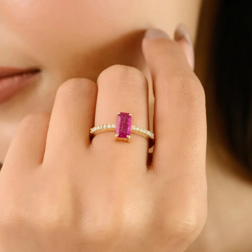 100% Genuine Prong Setting Ruby & Diamond Gemstone Ring Trending 14K Yellow Gold Jewelry