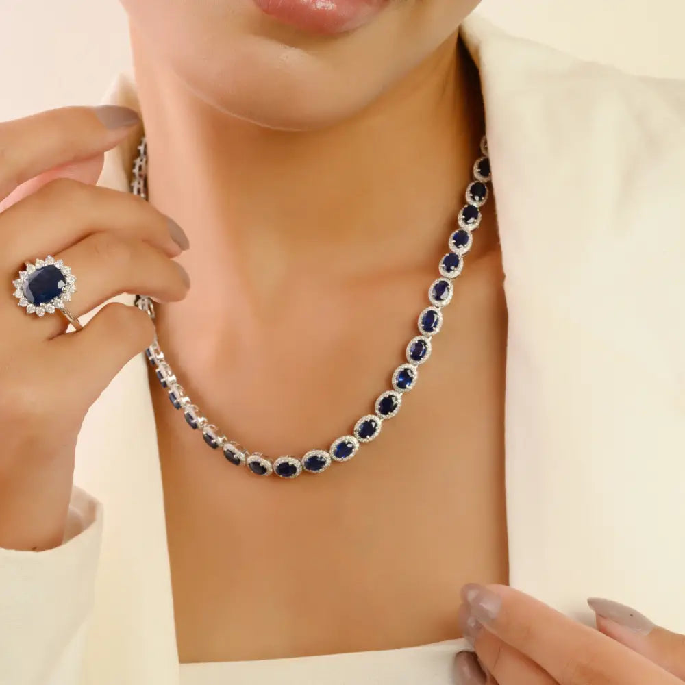 Exclusive Jewelry Statement Blue Sapphire & Diamond 14K White Gold Halo Tennis Necklace