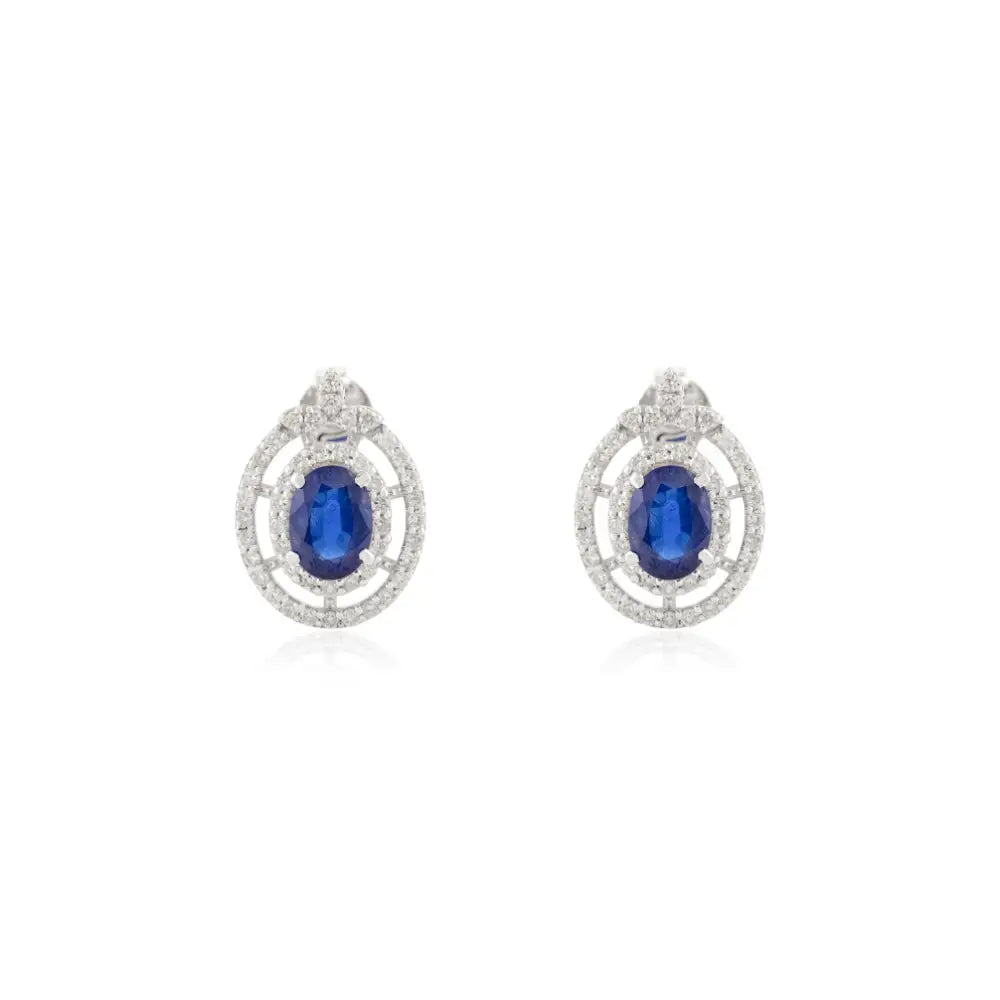 Unique Design Statement Stud Earrings Blue Sapphire & Diamond 14K White Gold Fine Jewelry