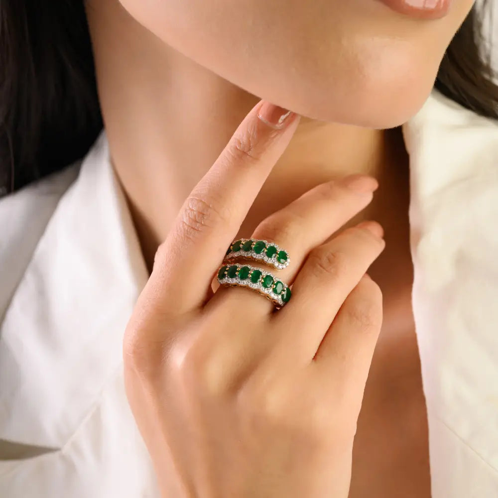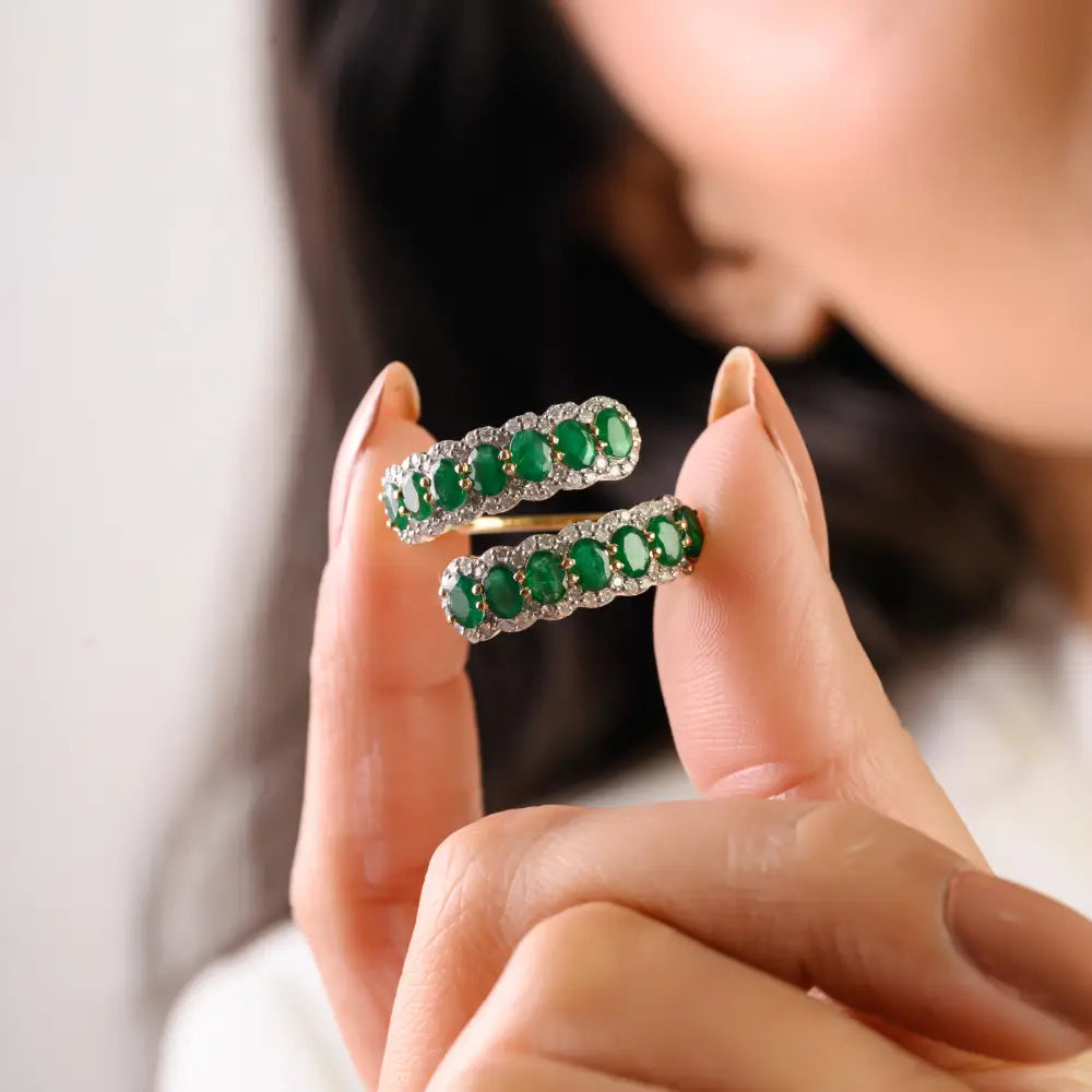 Zambian Emerald & Diamond Fine Bypass Ring 14K Real Yellow Gold Wedding Bridal Jewelry